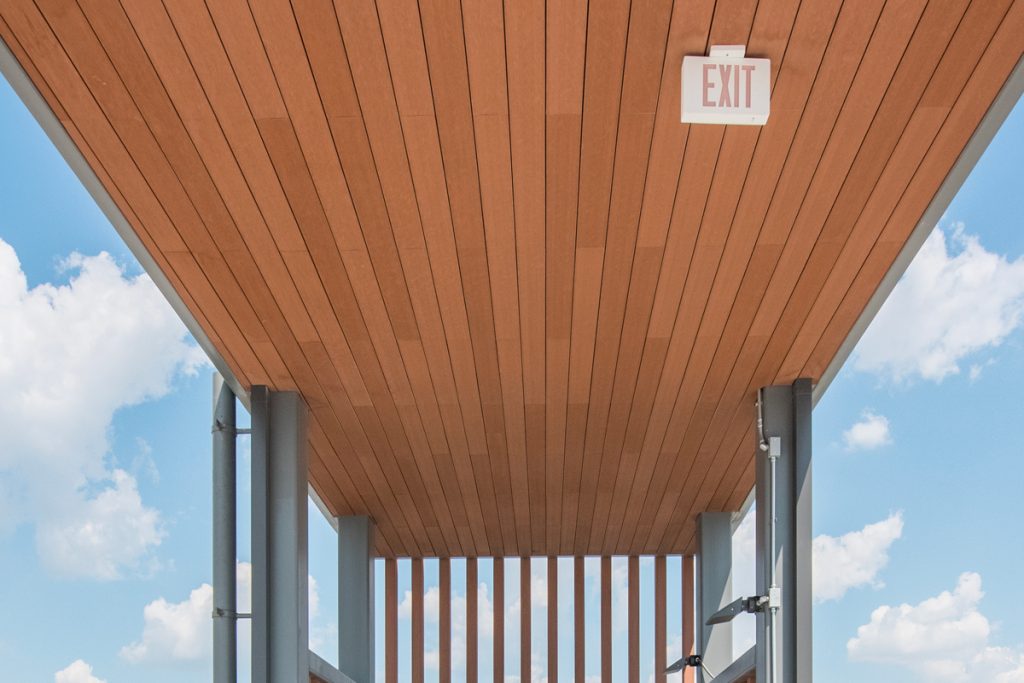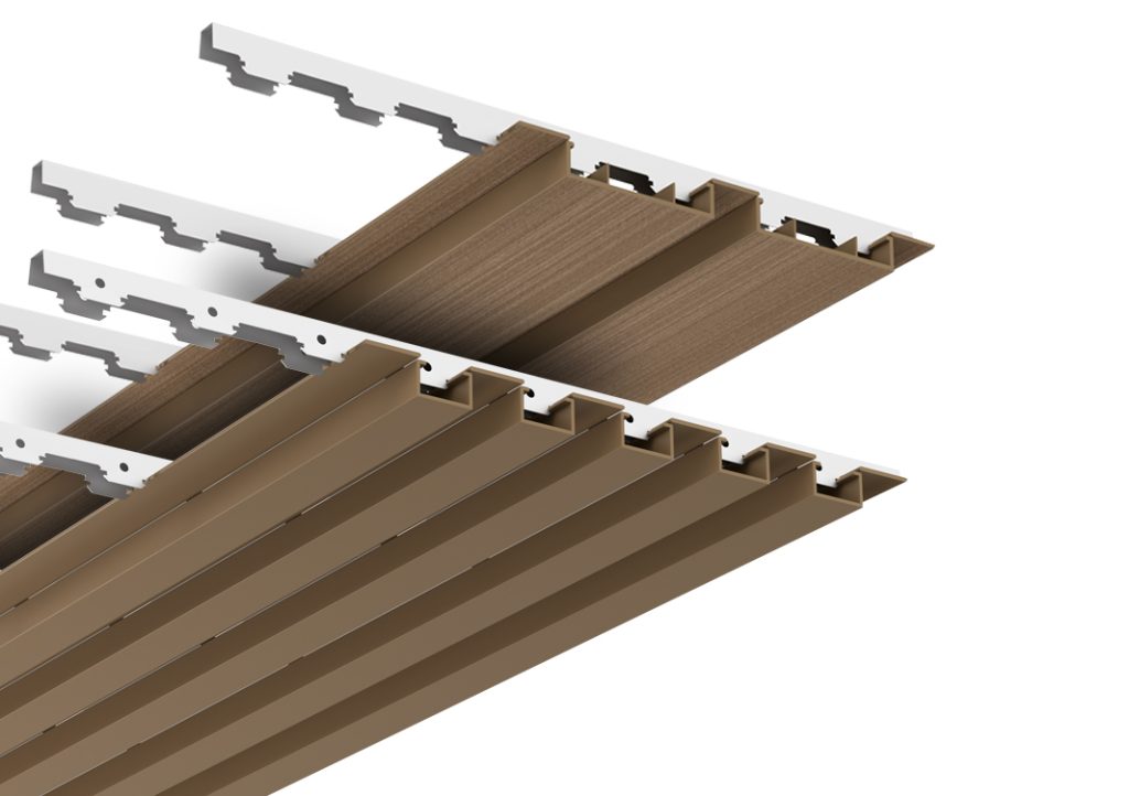 Trần giả và mặt phẳng ốp tường Modulatus WPC có sẵn với lớp hoàn thiện và dải màu tương tự như lớp phủ ốp tường thẳng đứng và thanh chắn nắng, mang lại sự liền mạch về mặt thẩm mỹ giữa mặt tiền hoặc tường, thanh chắn nắng và trần giả.