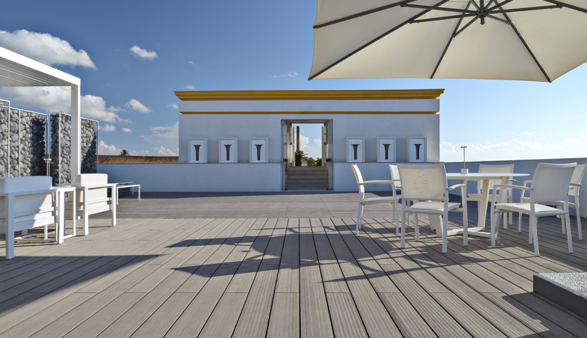 Hệ thống sàn WPC ngoài trời và hồ bơi có bề mặt chống trượt, chống thấm nước, chống ẩm và chống tia UV, đảm bảo độ bền màu trong mọi điều kiện thời tiết.